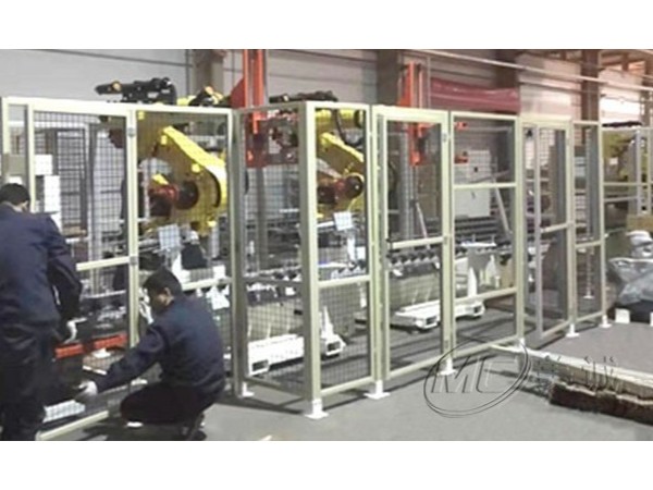 機器人護罩是在設備外圍建立安全范圍防護措施,以劃分安全范圍,阻隔人或物與設備直接接觸,起到安全警示作用,常和報警及斷電設備配套使用??蚣懿糠质褂娩X型材,配合絲網、亞克力、PC等各類板材,通過鋁型材配件安裝膨脹螺栓連接鋁型材立柱和地面。